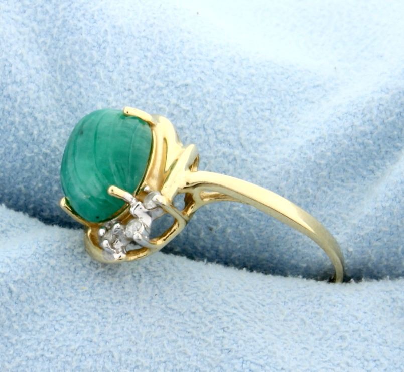 In 14K yellow gold there is a 10x8mm cabochon jade and three .01ct diamonds. Size 8 1/4 3.3g