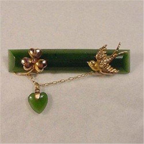 A bar brooch dating from Edwardian times (circa 1901-1910) - made in New Zealand greenstone (nephrite jade), with a gold Bluebird of happiness on one side, and a four leaf lucky clover on the other. Suspended on a gold chain between the two is a greenstone heart. Most unusual design for one of these NZ bar brooches, and very pretty. Greenstone jade is a sacred stone to the New Zealand Maori.