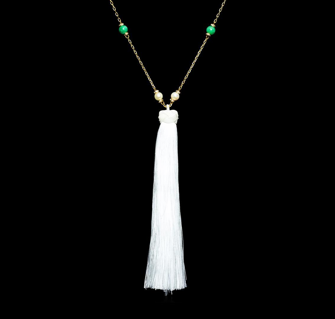 High end designer jewelry. Jade and Pearl Necklace - Gold Plated. Gold- Plated Copper Chain/2.5" Ext Clasp. Gld/ Grn/ Wht. 38/2.5inches. Total Weight: 26.1 grams.