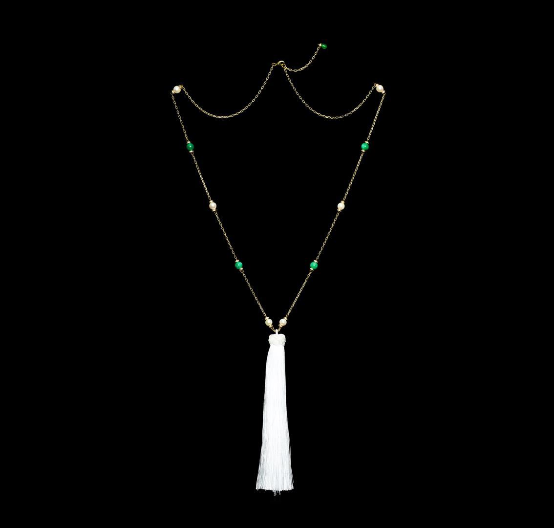 High end designer jewelry. Jade and Pearl Necklace - Gold Plated. Gold- Plated Copper Chain/2.5" Ext Clasp. Gld/ Grn/ Wht. 38/2.5inches. Total Weight: 26.1 grams.