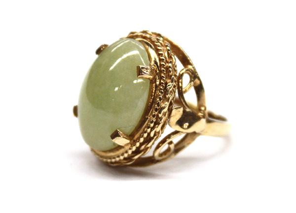 Jade cabochon set 14k yellow gold ring. Total ring weight 7.2 grams. Ring size 6.5