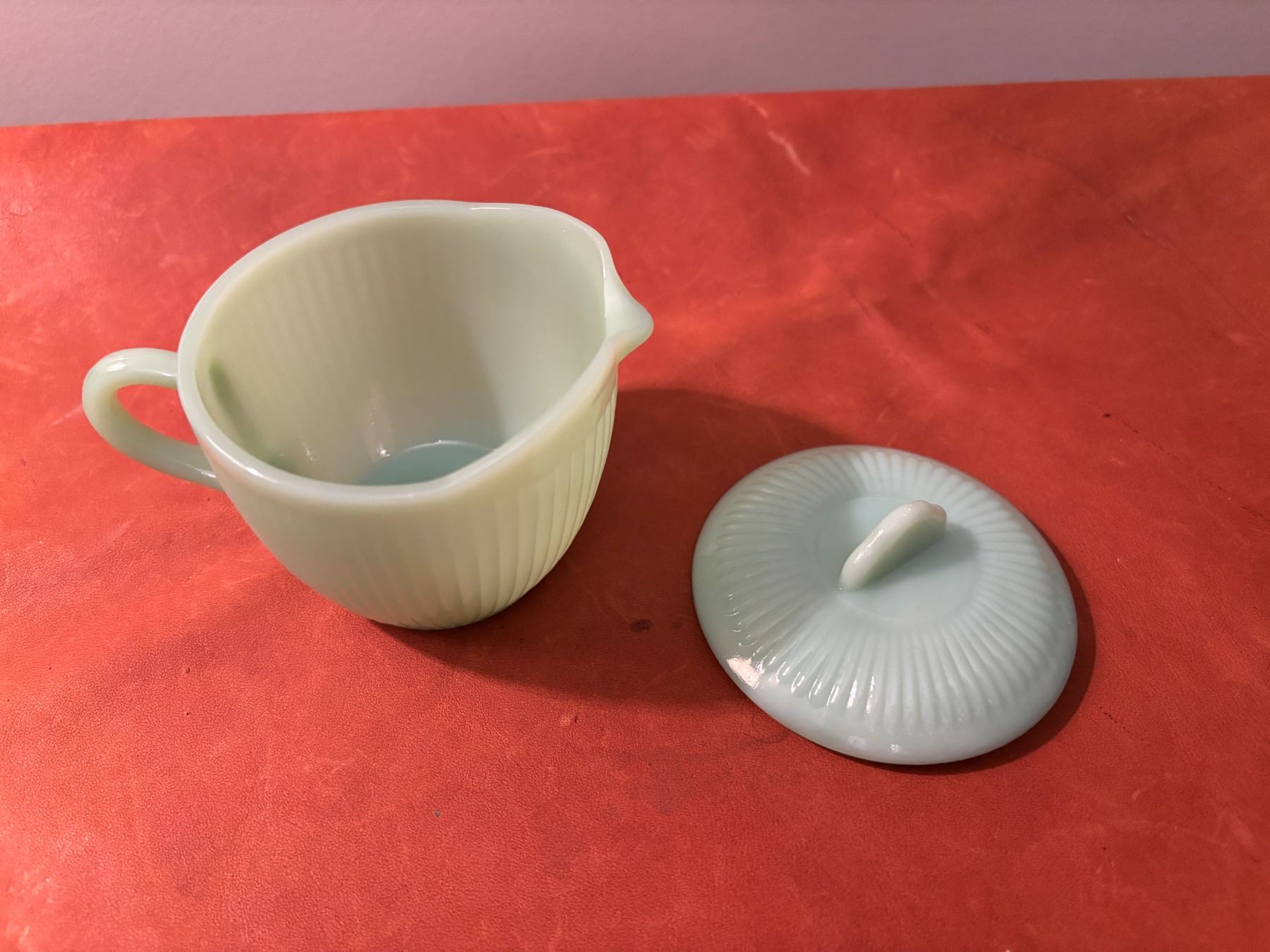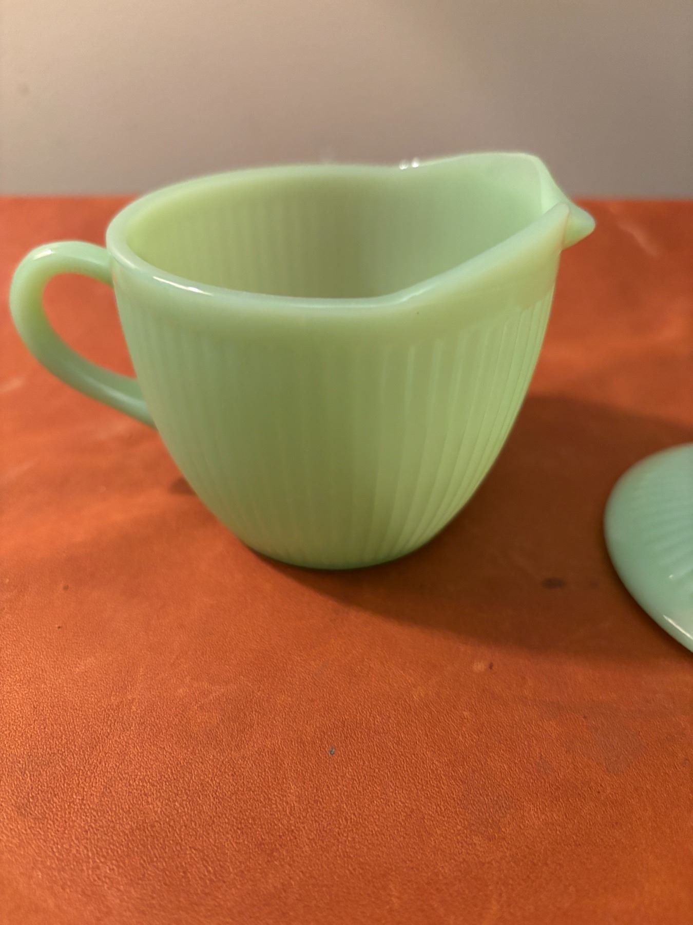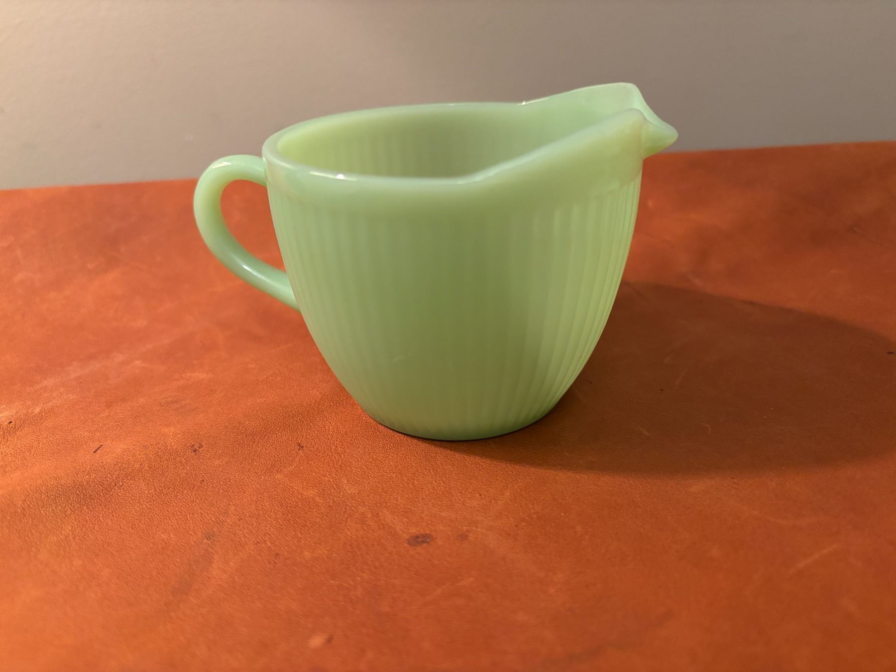 Measures 4.5” across with handle, 3” high. Ribbed exterior, smooth interior. No chips/cracks/ no makers mark on bottom