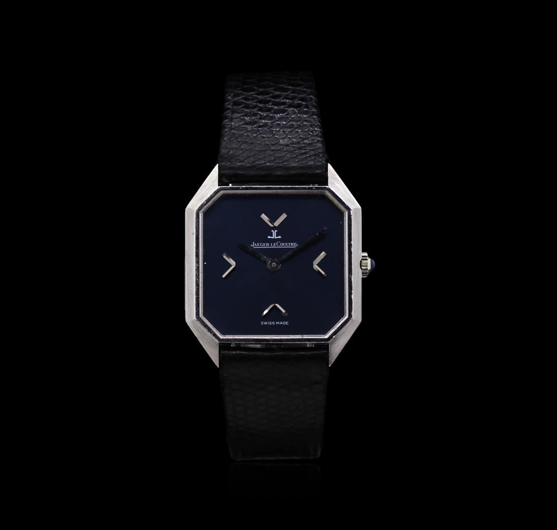 Swiss made. Case: Stainless steel. Dial: Dark blue/purple color; silver tone hands; signed Jaeger LeCoultre. Band: Black alligator leather.