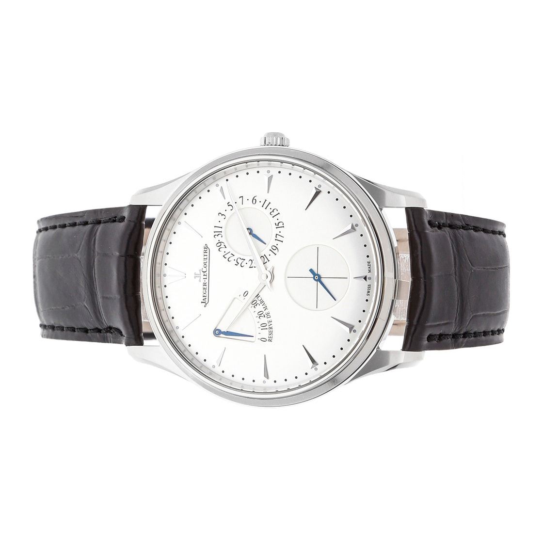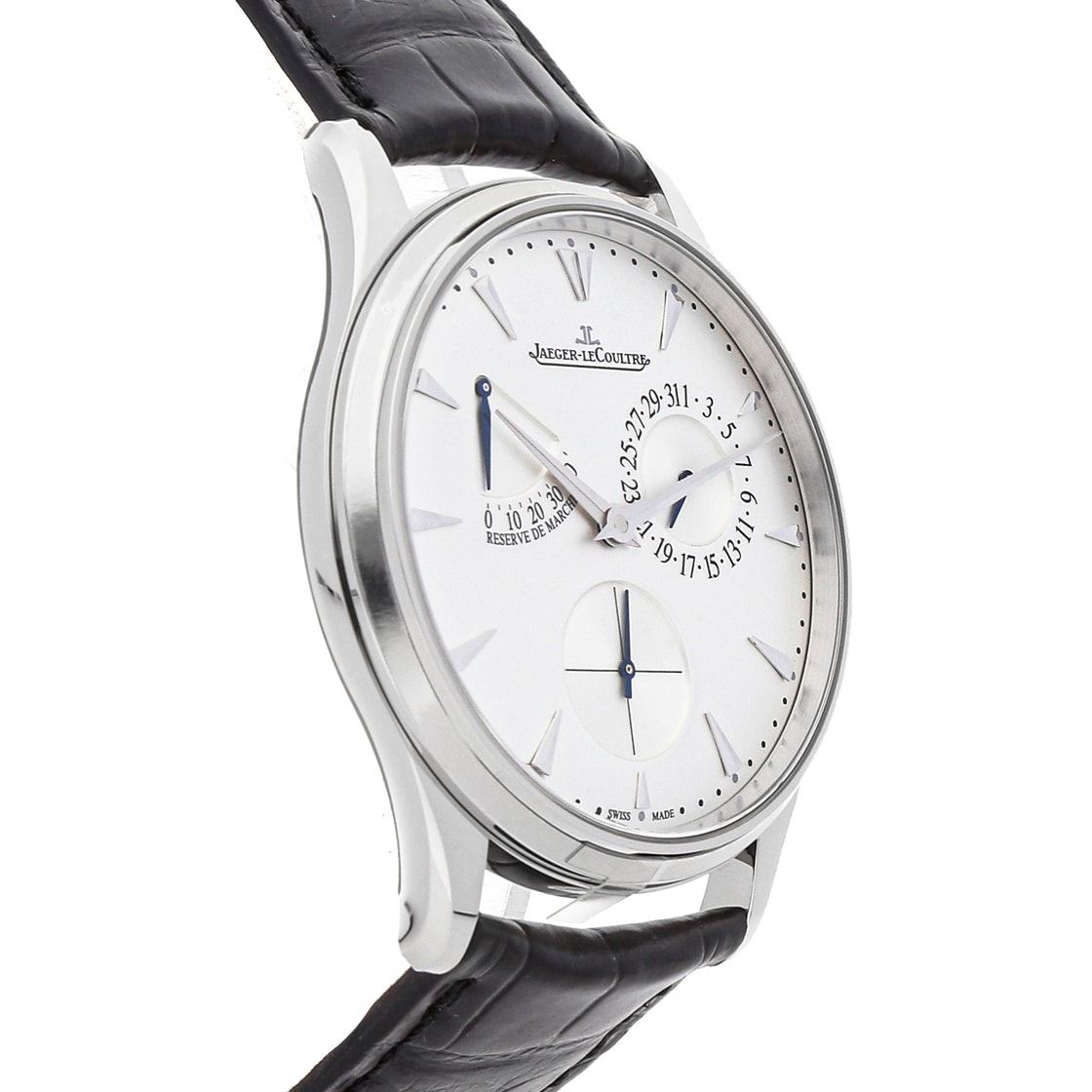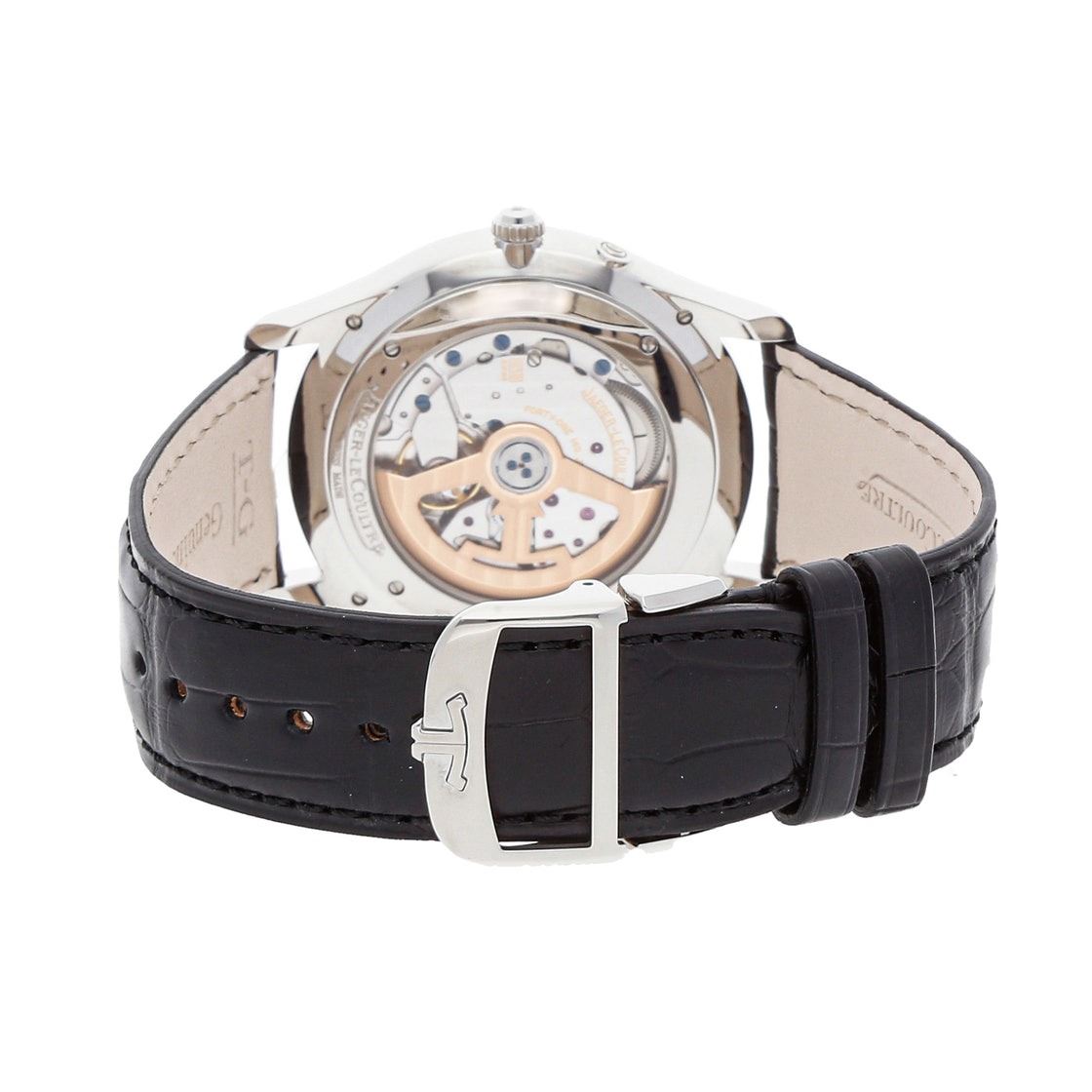 Jaeger-LeCoultre Master Ultra Thin Reserve de Marche (Q1378420) self-winding automatic watch, features a 39mm stainless steel case surrounding a silver dial on a black alligator strap with a stainless steel deployant buckle.