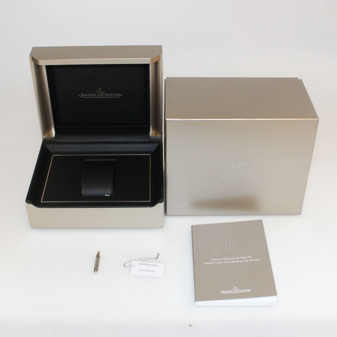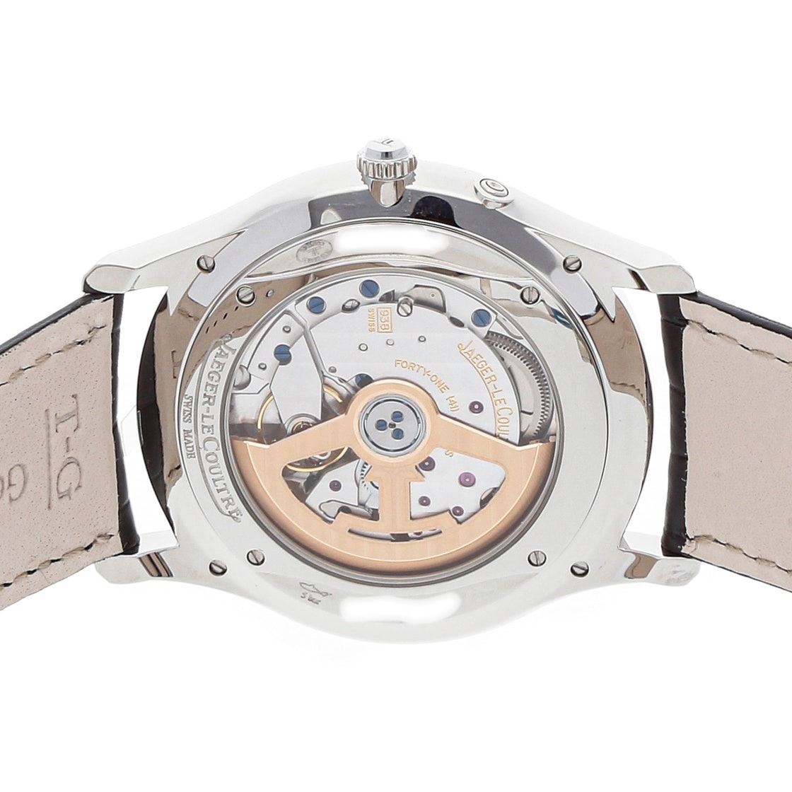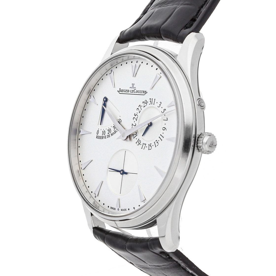 Jaeger-LeCoultre Master Ultra Thin Reserve de Marche (Q1378420) self-winding automatic watch, features a 39mm stainless steel case surrounding a silver dial on a black alligator strap with a stainless steel deployant buckle.
