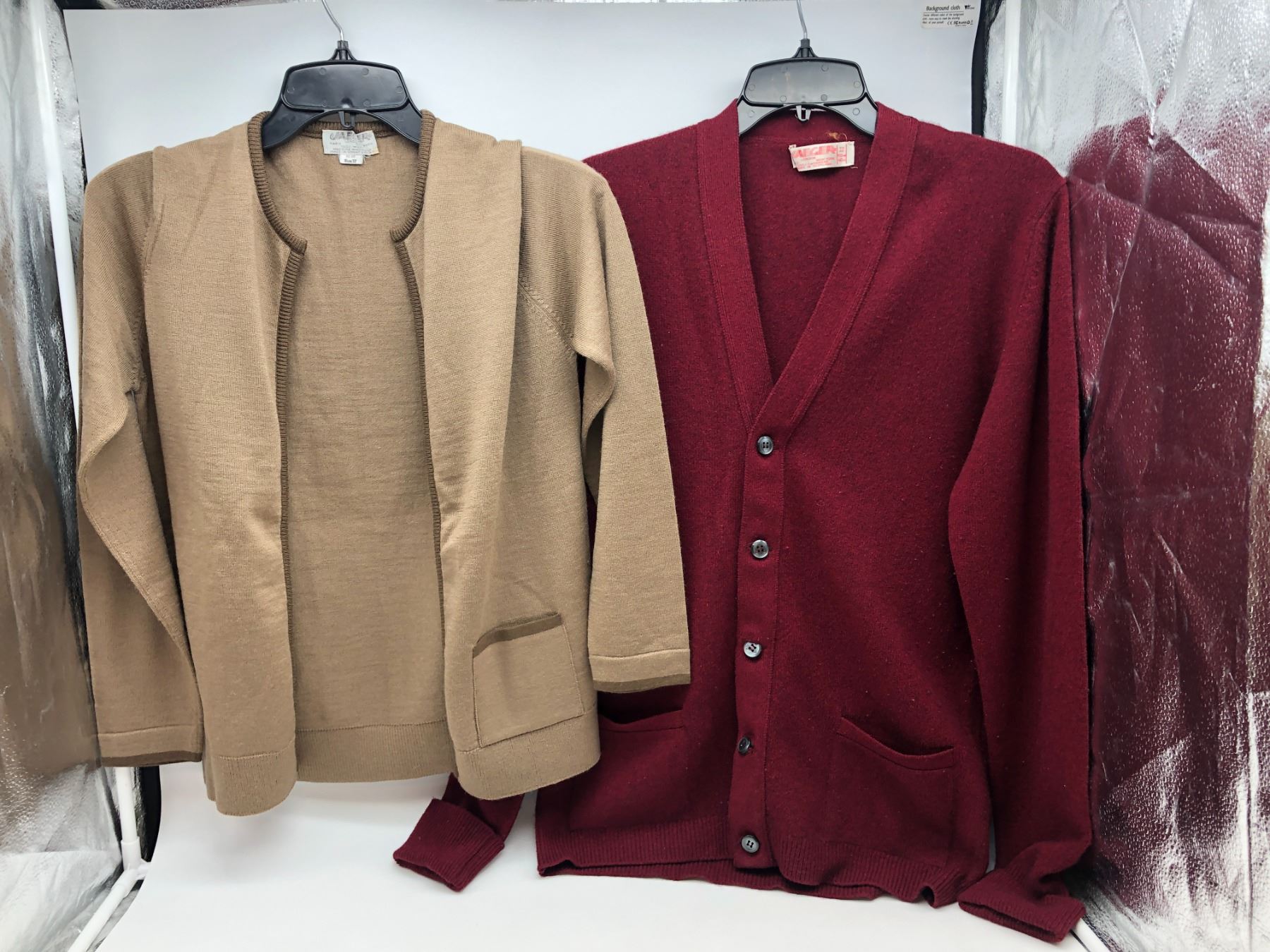 "Jaeger - London" - Group of 2 women's cardigans - includes 100% Cashmere red cardigan (Size: 40) & 100% wool brown cardigan (Size: 32)