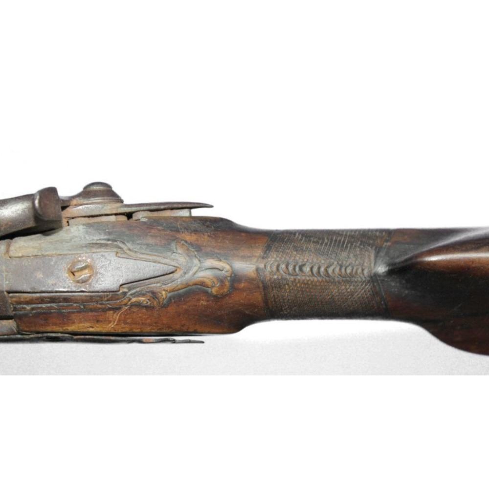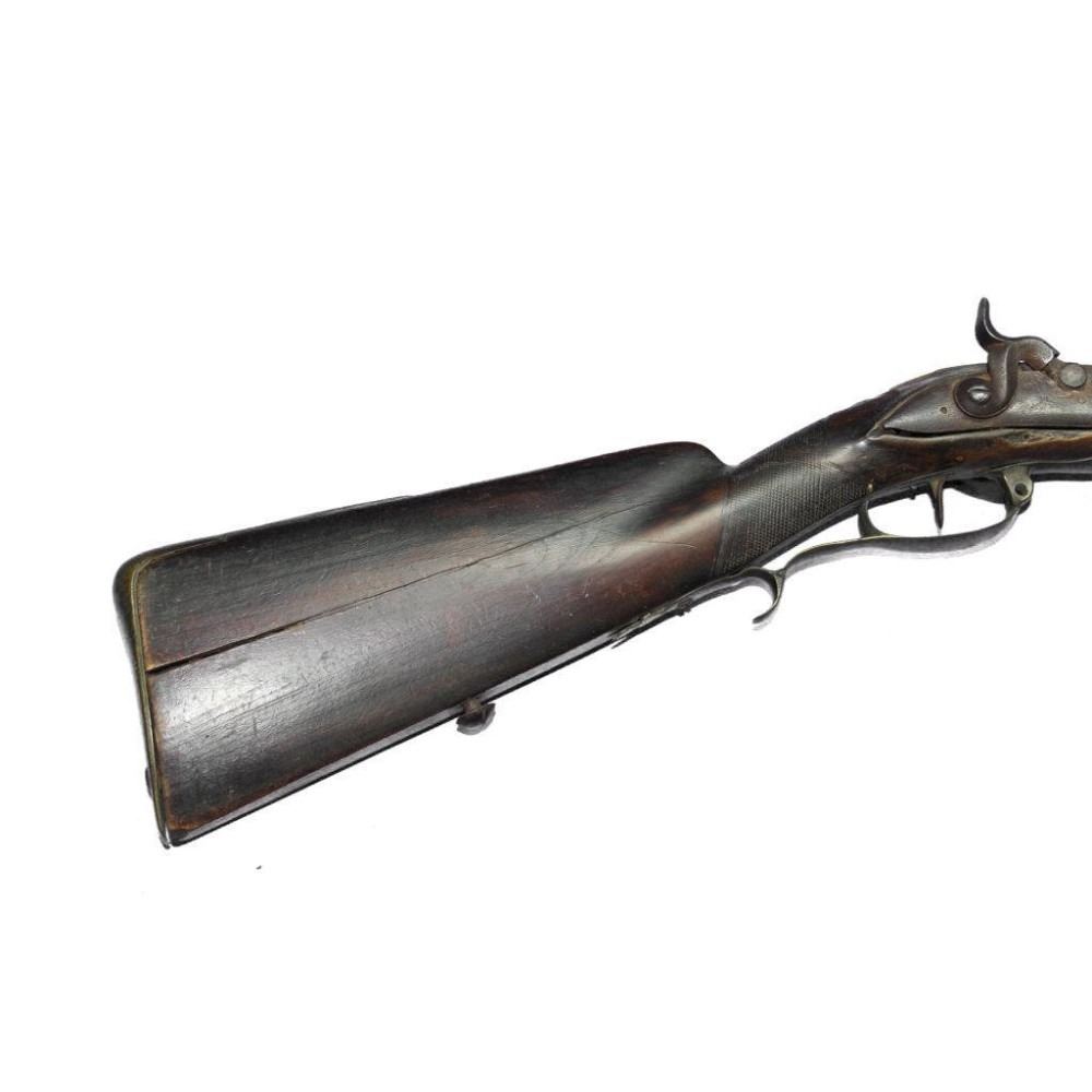 Item Description: .574" Bore, Shotgun, S/n Nsn, Brl Length 31.5", Converted Percussion, Poor Condition, Believed To Be An Original German Jaeger, Having A Nicely Carved Straight Grip Checkered Walnut Stock With Cheek Rest Being Carved At Transition Toward Butt, Stock Showing Major Damage Having Losses And Cracks, Missing Grip Cap, Front Ramrod Pipe & Ramrod, Brass Retainer Plate Is Missing A Screw, Brass Butt Plate, And Trigger Guard Both Showing Light Wear, Lock Is Lightly Pitted And Appears Fast, Trigger Guard Has Hole In Front For Sling Attachment With forwarding Mounted Swivel, Brass Fixed Front Sight. - 9976-032418-PB-00943