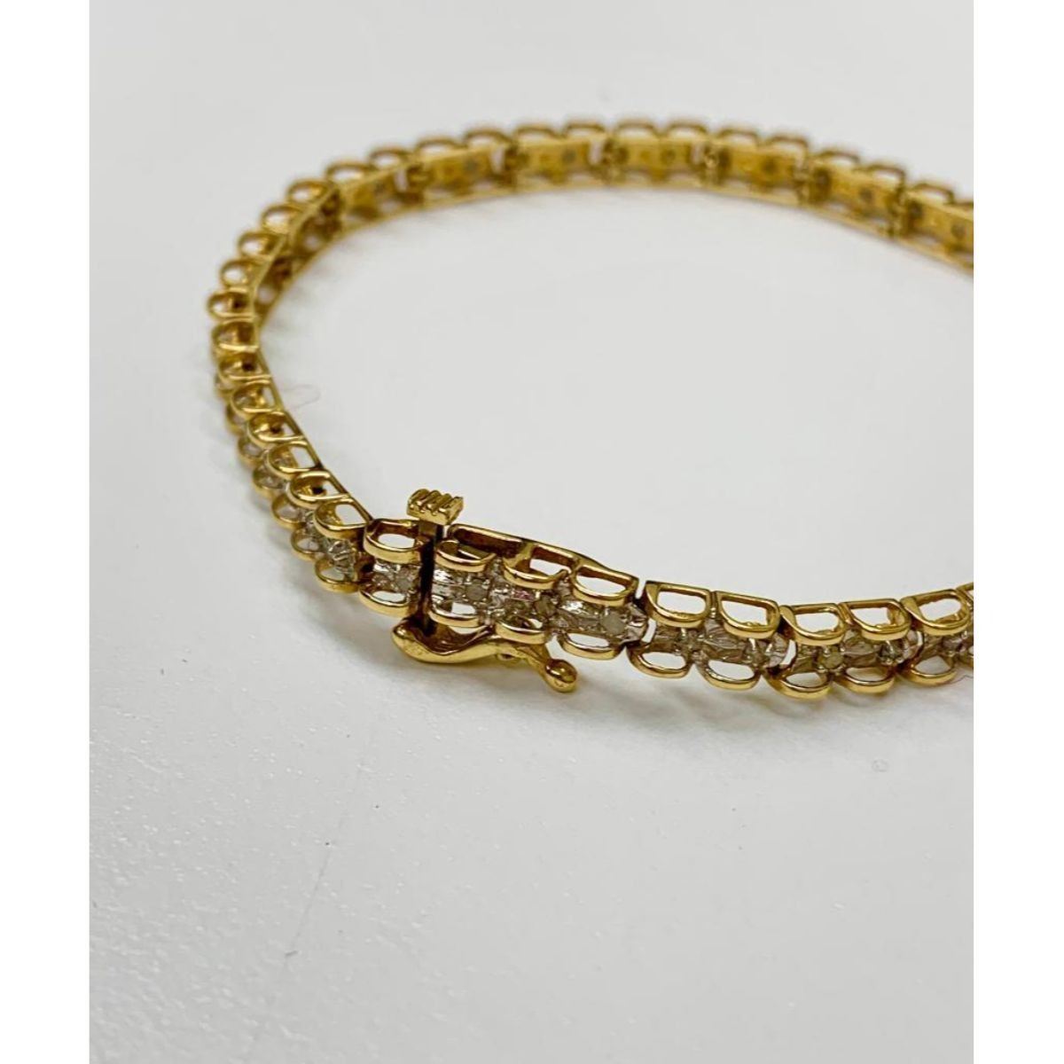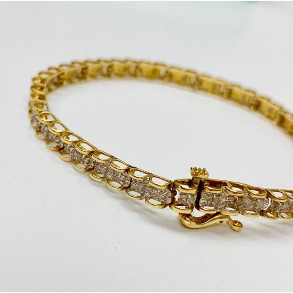 A Jafa Ladies 10kt Gold and diamond Bracelet. This Bracelet is beautifully crafted, as it is both light weight and stylish. With the combination of fire from the stunning round cut diamonds, and bright luster of the gold, this bracelet is sure to match perfectly with any dark outfit. Please view photos for further details.