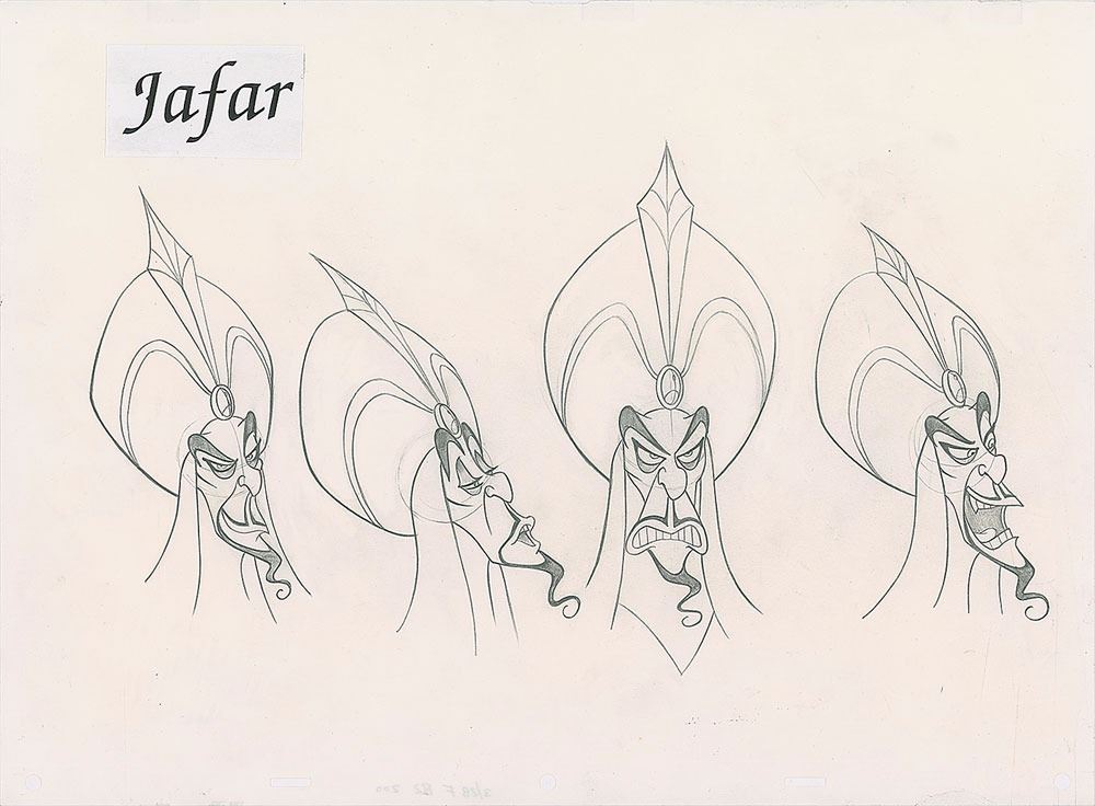 (Walt Disney Studios, 1992) Original character model drawing of Jafar's face close-up in four different positions, accomplished in graphite on untrimmed 17 x 12.5 animation paper. A "Jafar" label is affixed to the upper left. In fine condition.