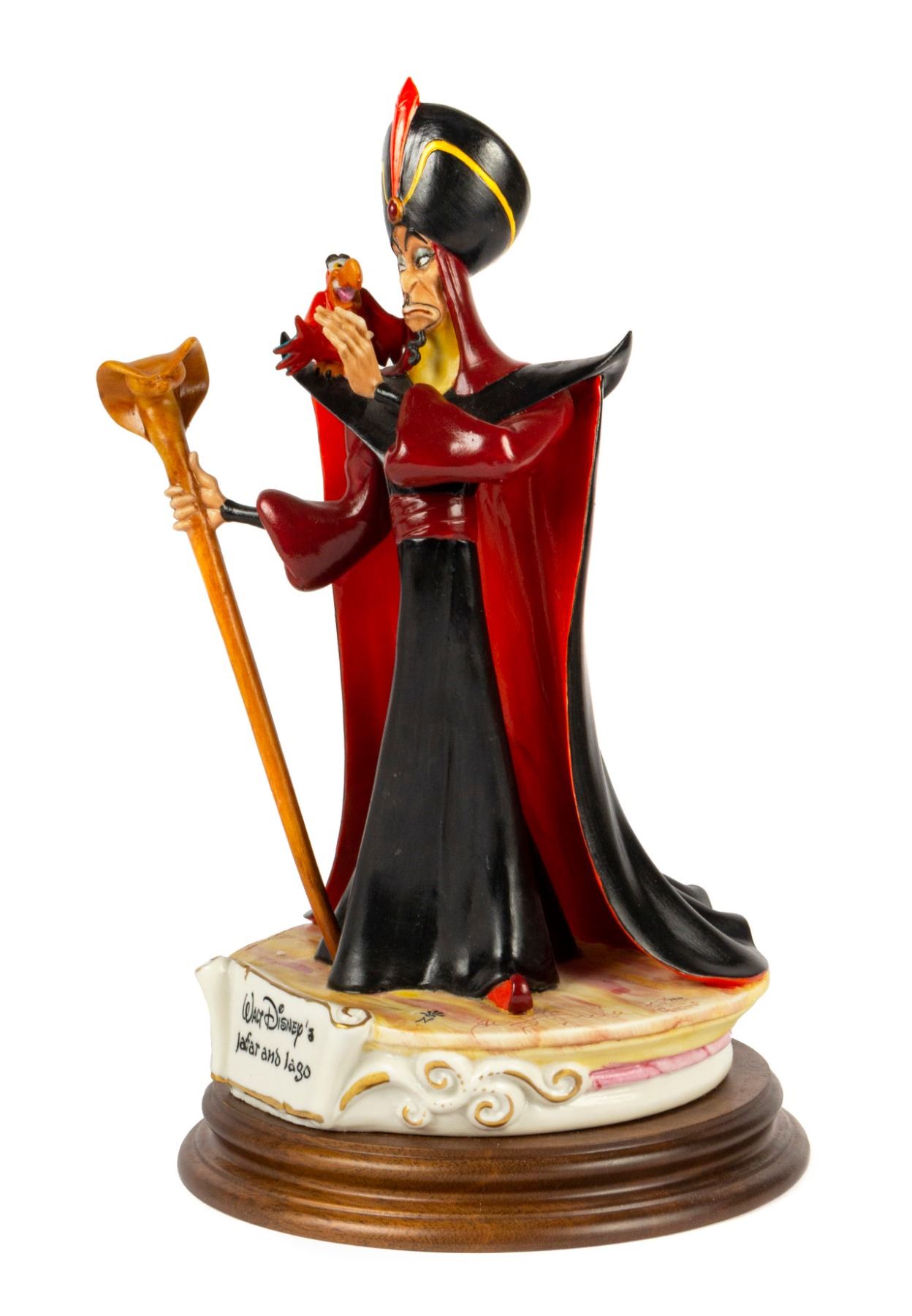 (Capodimonte, 1994) A beautiful hand-crafted sculpture of Jafar and Iago by the Italian company Capodimonte. Crafted in porcelain on a wood base, the sculpture is marked on the base as number 74, and measures 13" tall. The condition is very good with minor surface wear from previous display.