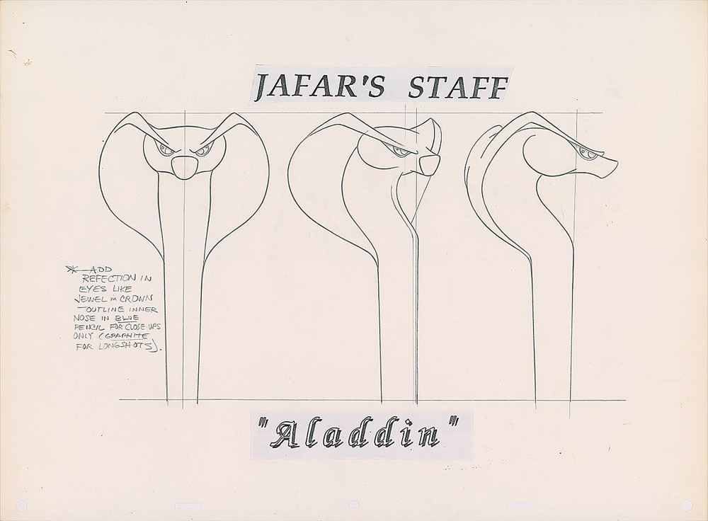 (Walt Disney Studios, 1992) Original model drawing of Jafar's snake staff from three different angles, accomplished in graphite on untrimmed 17 x 12.5 animation paper. A note on the left side reads: "Add reflection in eyes like jewel in crown—outline inner nose in blue pencil for close-ups only (graphite for longshots)." Two labels are affixed to the sheet. In fine condition.
