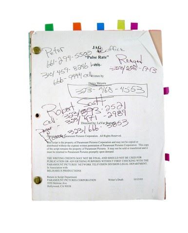 Direct from the CBS acclaimed TV show Jag (1995–2005) is the actual shooting script from the episode entitled "Pulse Rate" complete with the screenplay with notes on the front cover. This production acquired and used piece measures approximately 8 1/2" x 11".