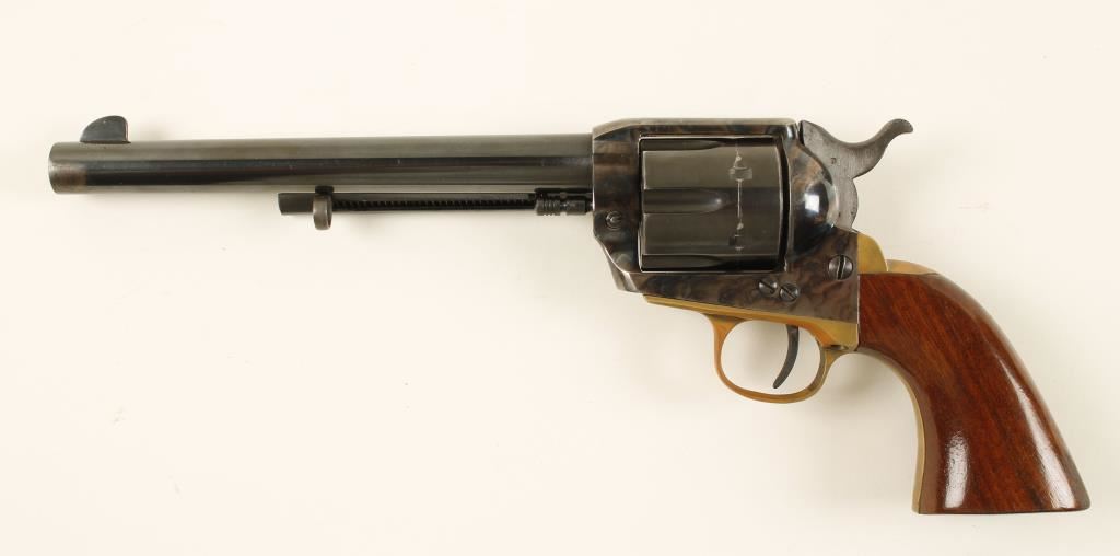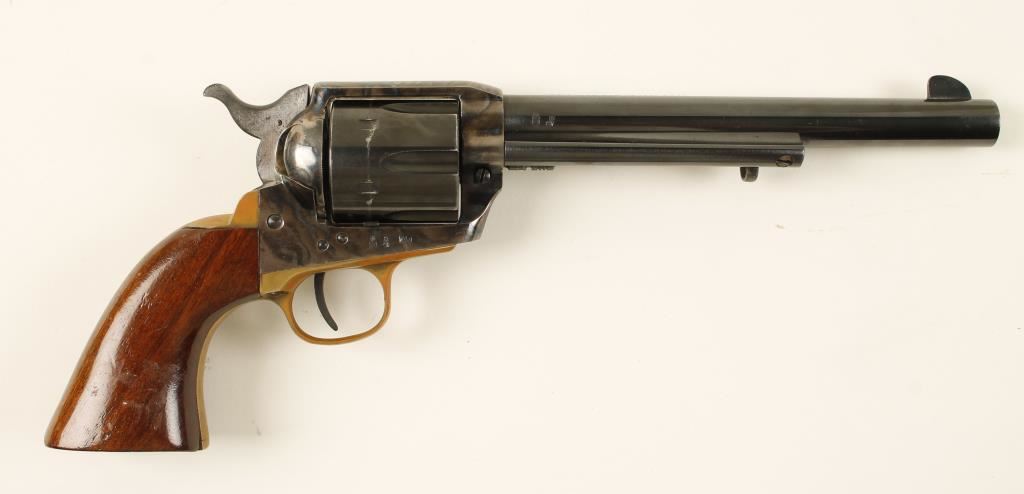 Italian made single action six shot revolver. 7.5" barrel, blued cylinder, trigger, hammer and barrel. Brass trigger guard and backstrap with case hardened frame. 70% blue remaining, bright case hardened colors in protected areas, brass is discolored. Wood grips in good condition. Overall condition is good. *Modern Firearm*