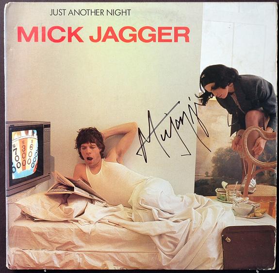 Jagger, Mick - "Just Another Night" Album Cover. Hand signed in black Sharpie. Released in 1985 by Columbia Records, Side A is an extended remix (7:12); Side B has a 4:42 edit and a 5:57 dub. The song appears on the album, "She's the Boss." Light edge wear to cover edges. Album is present.