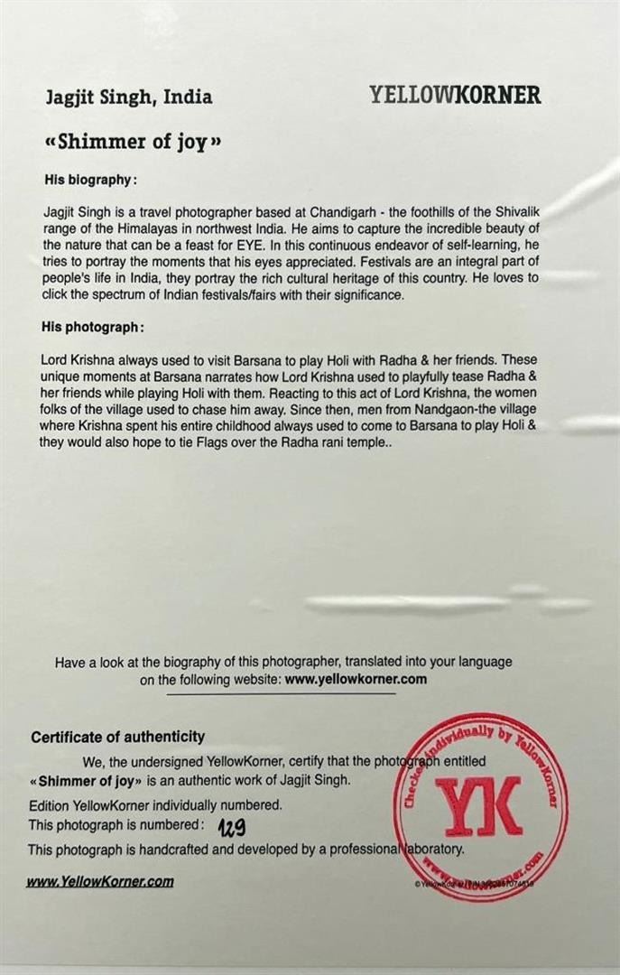 Jagji Singh India Shimmer Of Joy YellowKorner Certified Photograph. Certificate of Authenticity from YellowKorner affixed to the back. Matted Dimensions 16"x20". Protected with Clear Mylar Sleeve.