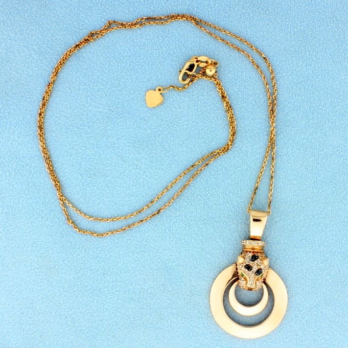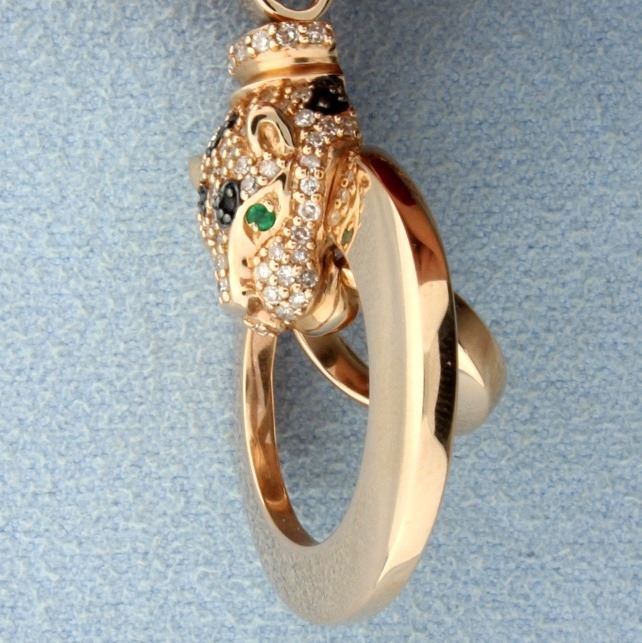 In 14K rose gold, the chain is 22 1/4 inches long-can be made smaller. The pendant is 1 1/2 inches long and contains five 1/2pt black diamonds and seventy 1/2pt white diamonds. The eyes are 1.6mm round emeralds. Look for matching ring.         9.1g