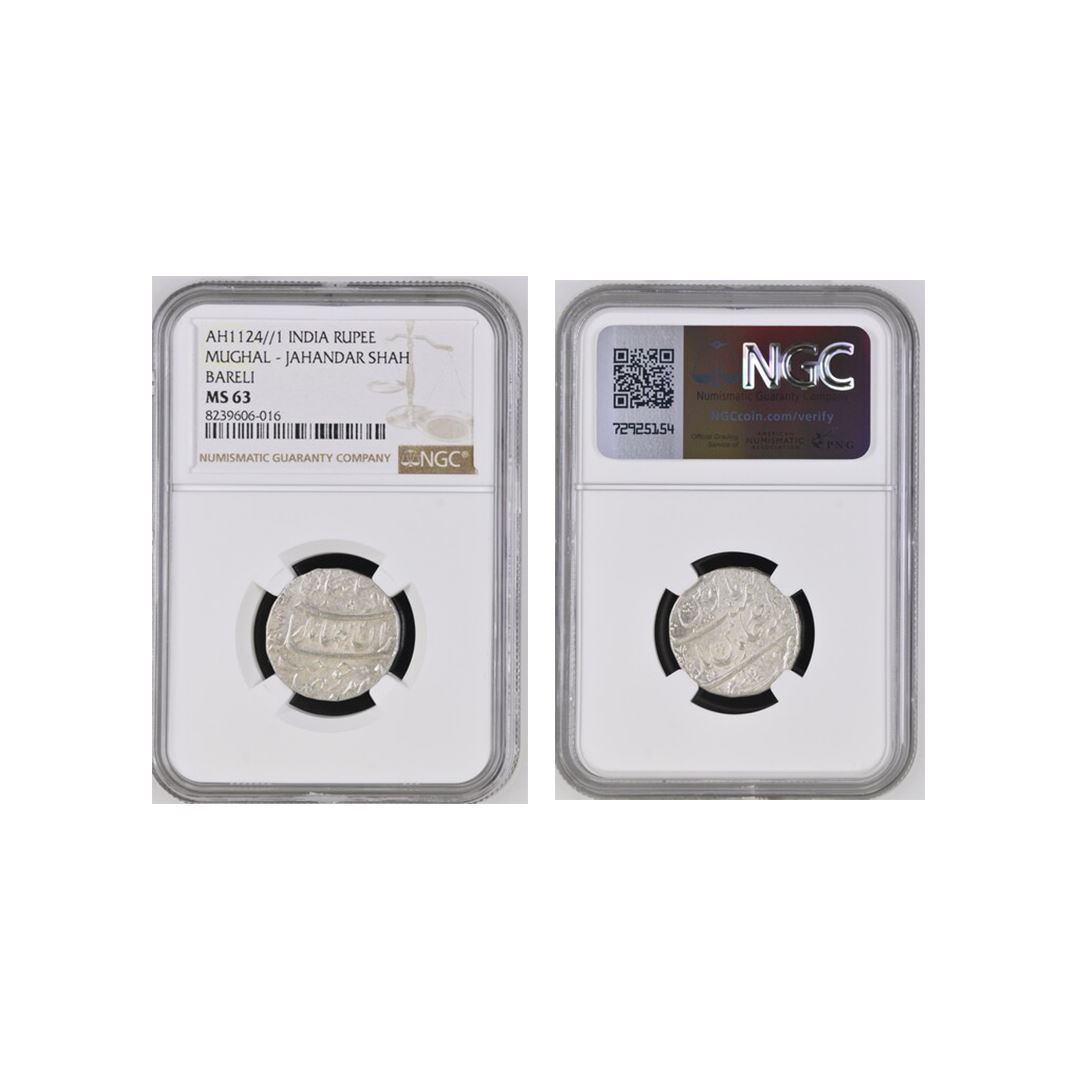 Jahandar Shah (1712-1713 AD), silver rupee, Bareli mint, 'Sahib Qiran' couplet, AH 1124/RY Ahd, KM 364.7, Graded MS63 by NGC, Rare.