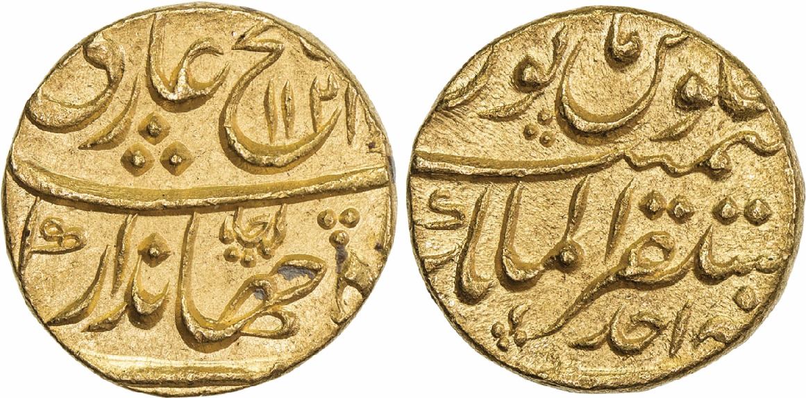 Jahandar Shah (AH 1124, 1712-1713 AD), Gold Mohur, 10.91g, Mustaqir ul Mulk Akbarabad Mint, AH 1124/Ahd, Obverse: an extra word ’Aja’ or ’Raja’ appears, Abu al fath couplet (KM 368.1). Graded by NGC MS63, Rare.