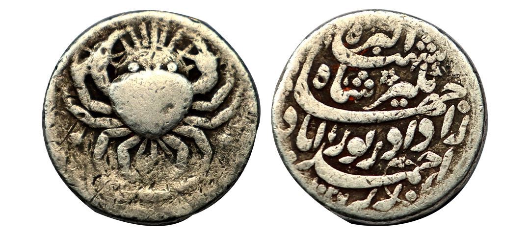 Jahangir (1605-1627 AD), Silver Zodiacal Rupee, 'Cancer' sign, Ahmadabad Mint, AH1027/RY 13, 11g. Obv: Sign of Cancer (Crab) against a solar backdrop, Farsi inscription Sanah 13 below. Rev: Farsi inscription Zar ra Ahmadabad Dad Zewar Jahangir Shah Shahanshah Akbar, (Gold was made into a jewel at Ahmadabad by King of Kings Jahangir the son of King Akbar), KM 150.10. Very Fine+, Extremely Rare.