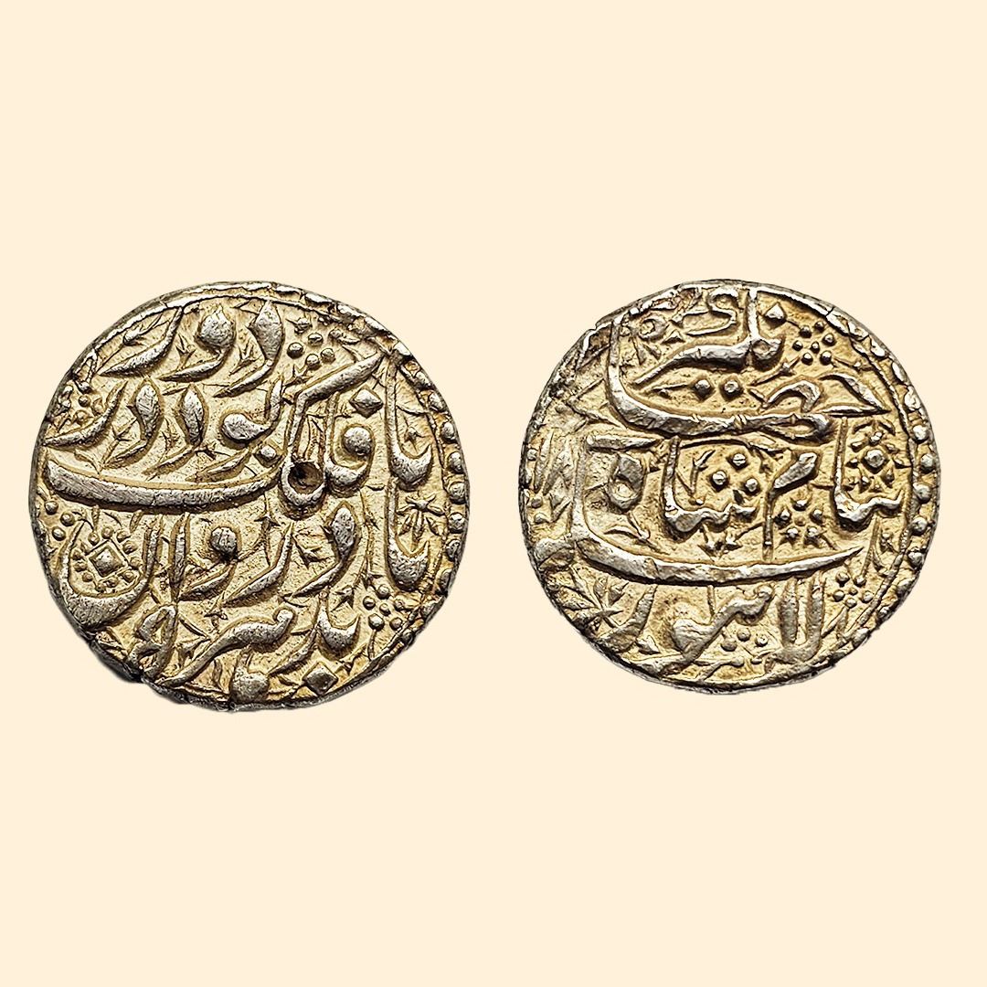 Jahangir (AH 1014-1037 / 1605-1627 AD), Silver Heavy Rupee, 14.22gms (25% over weight), known as ’ Sawai’ Rupee, Lahore Mint, AH 1018, RY 5, Ta-Falak couplet which reads as Ta Falak bud dar bad rawan bad har; Sikka Lahore banam Shah Jahangir, these coins were struck only during the fourth, fifth and sixth regnal years of the emperor. (KM # 158.5). Very Rare. Extremely fine