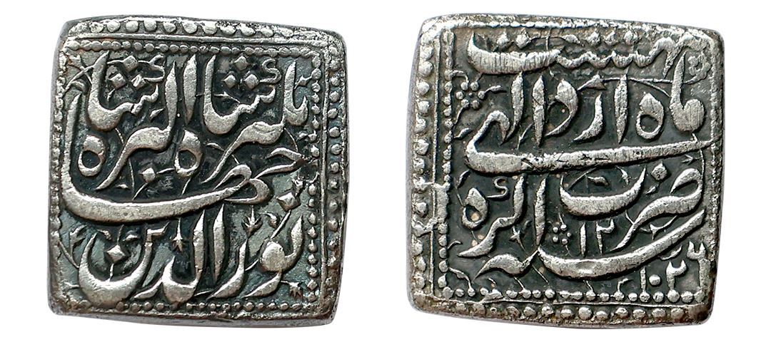 Mughal, Jahangir (AH 1014-1037, 1605-1628 AD), Silver Square Rupee, 10.97 gms, Agra Mint, Ilahi type, Month Ardibahist, AH 1026, RY 12, Obv. Nur al-din Jahangir Shah Akbar Shah, Rev. sana zarb agra maah ardibahist Ilahi, KM # 147.2, very fine+, very rare.