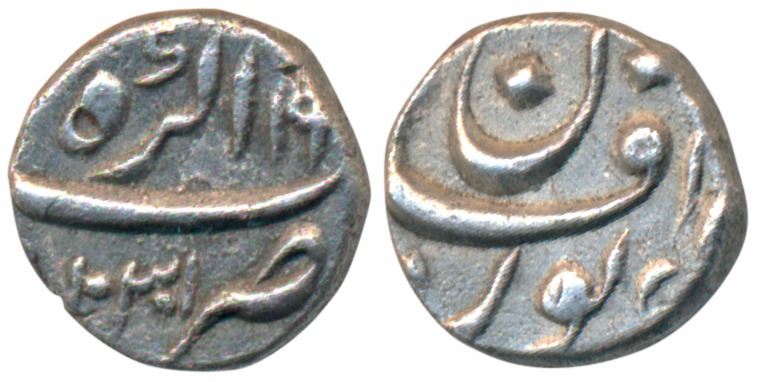 Noor Afshan means light scattering; was an important largesse coin of the Emperor. He would use them for scattering during processions. The Khair -e Qabul too was used for scattering, but in religious places. Khair-e-Qabul means the alms may be accepted. Jahangir (AH 1014-1037, 1605-1627 AD), Silver 1/16 Rupee Nisar of “Nur Afshan”, 0.56g, Agra Mint, Obverse: Noor Afshan, Reverse: complete mint name at top with AH 1031/19 (KM 165.1). Extremely Fine, Extremely Rare.