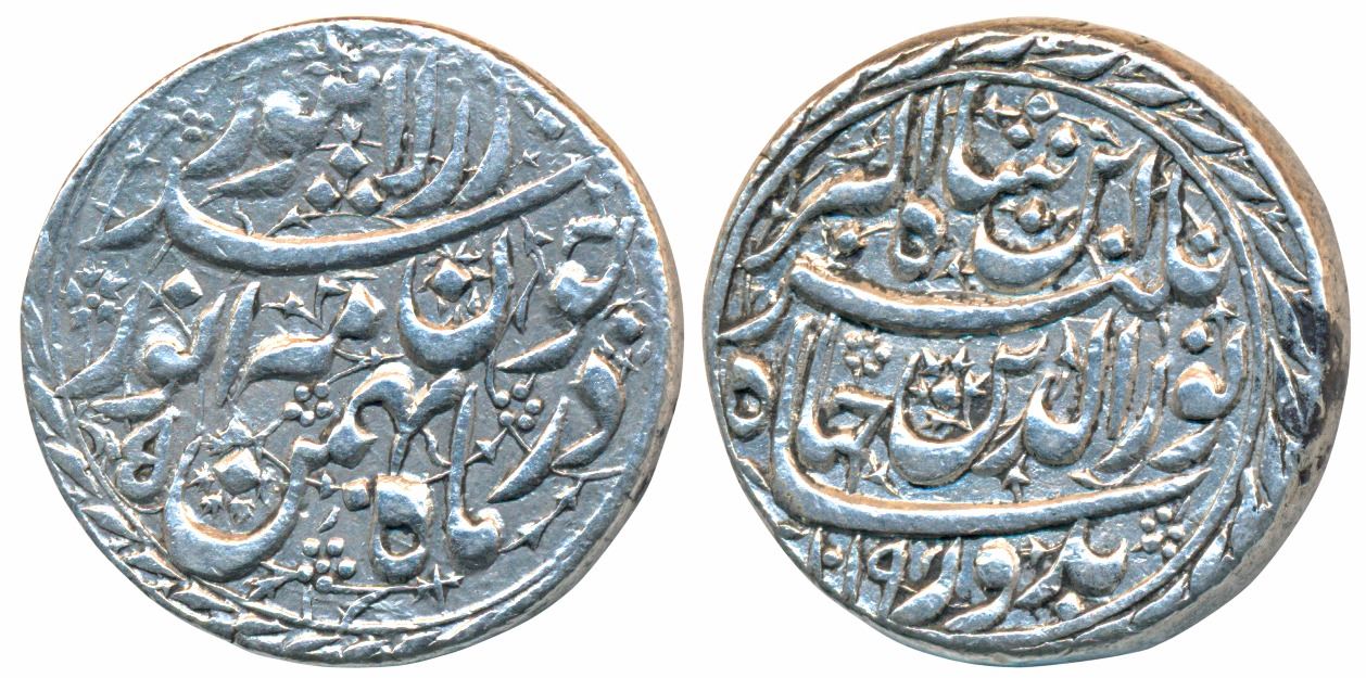Jahangir, Silver Heavy Rupee, 14.22g, 25% overweight hence known as ’Sawai’ Rupee, Lahore Mint, AH 1019/5, month Bahman, Bahman Mah-e-Anwar couplet (with a new rhyming couplet for each month), Obverse: Zare Lahore Shud dar Mah-e-bahman Chun Mahe Anwar, that is ’In the month of Bahman the gold of Lahore became like the shining moon’, Reverse: Badaure Shahe Badaure Shahe Nur-ud-Din Jahangir Ibn Shah Akbar, that is ‘In the reign of Shah Nur al-Din Jahangir, son of Shah Akbar’ with nice decorative border (KM 159.1). About Extremely Fine, Extremely Rare.