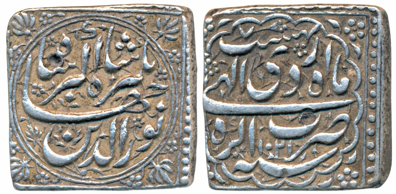 Jahangir, Silver Square Rupee, 11.39g, Agra Mint, Month Ardibihisht, AH 1021/7, Obverse: legend within an ornate circular border, Reverse: legend within scalloped border, very decorative on both sides, Unlisted in KM. Extremely Fine, Rare.