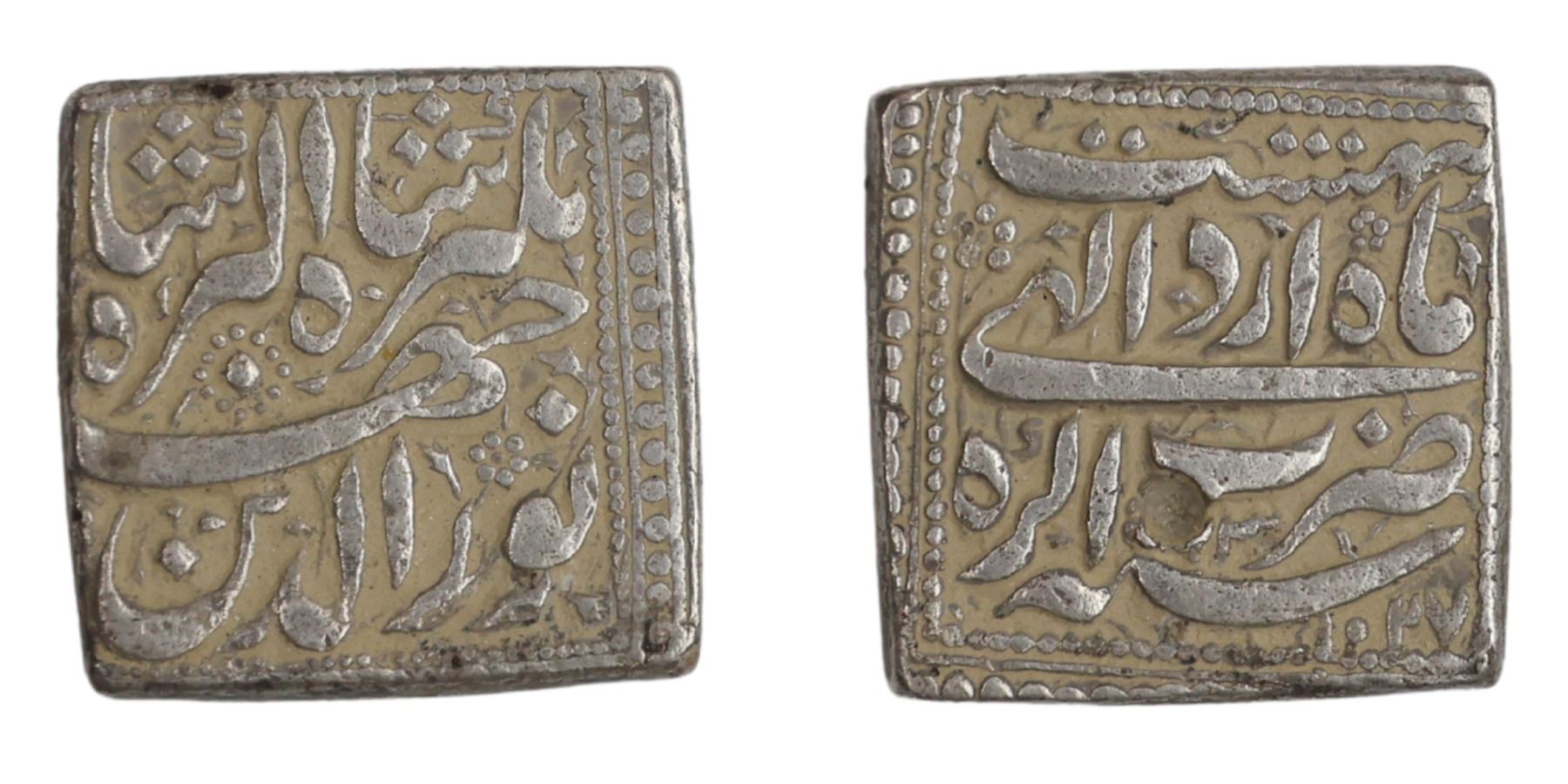 Jahangir (AH 1014-1037 / 1605-1627 AD), Silver Square Rupee, 11.38g, 18.89x18.59mm, Agra Mint, Ilahi type, Month Ardibihisht, AH 1027/ RY 13, both sides legend within dotted square. (KM # 147.2). test mark, Very Fine+. Rare.