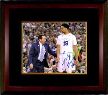 At Duke, Jahlil Okafor earned the USBWA National Freshman of the Year and ACC Player of the Year. He was also a unanimous 2015 NCAA Men's Basketball All-American first-team selection. In the week following Duke's victory in the championship game of the 2015 NCAA Men's Division I Basketball Tournament, Okafor announced he would enter the 2015 NBA draft. He was selected with the 3rd overall pick by the Philadelphia 76ers. Jahlil Okafor has hand signed Duke Blue Devils 16x20 Photo with #15 inscription. Schwartz Sports Hologram and Certificate of Authenticity from Athlon Sports. Custom Black Mat and Premium Mahogany Color Frame.