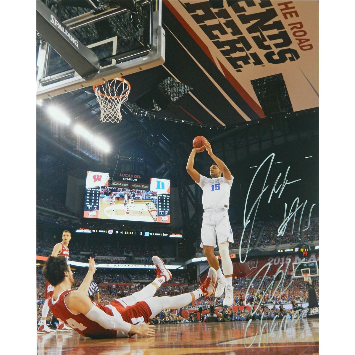 Jahlil Okafor signed Duke Blue Devils jump shot action 16x20 photo with '2015 Champs' inscription. Item comes with a Schwartz Sports Memorabilia tamper-proof numbered hologram and Certificate of Authenticity which can be verified online.