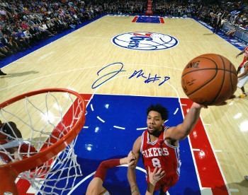 At Duke, Jahlil Okafor earned the USBWA National Freshman of the Year and ACC Player of the Year. He was also a unanimous 2015 NCAA Men's Basketball All-American first-team selection. In the week following Duke's victory in the championship game of the 2015 NCAA Men's Division I Basketball Tournament, Okafor announced he would enter the 2015 NBA draft. He was selected with the 3rd overall pick by the Philadelphia 76ers. Jahlil Okafor has hand signed this Philadelphia 76ers 8x10 Photo with #8 inscription. Schwartz Sports Hologram and Certificate of Authenticity from Athlon Sports.