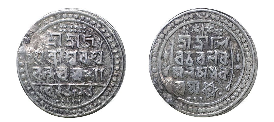 Jaintiapur, Chattra Simha (1774-82), Silver Rupee, 9.14 gms, SE 1696, Obv. Sri Sri Si/va Charana Ka/mala Madhu Ka/rasya and a six-pointed star, Rev. Sri Sri Ja/yantipura Pu/randarasya Sa/ke1696, flowers at the left and right of the top line, with petals of elongated dots, within a double circled border with beads in between, KM # 185, RB # L2, very fine, very rare ruler.