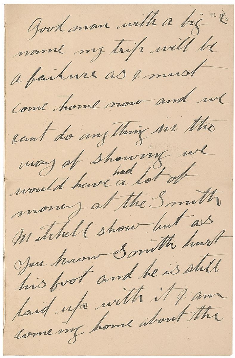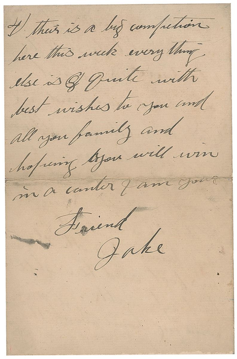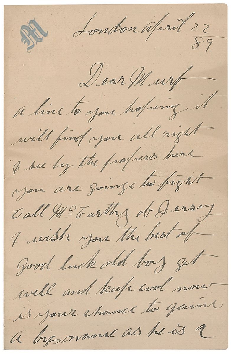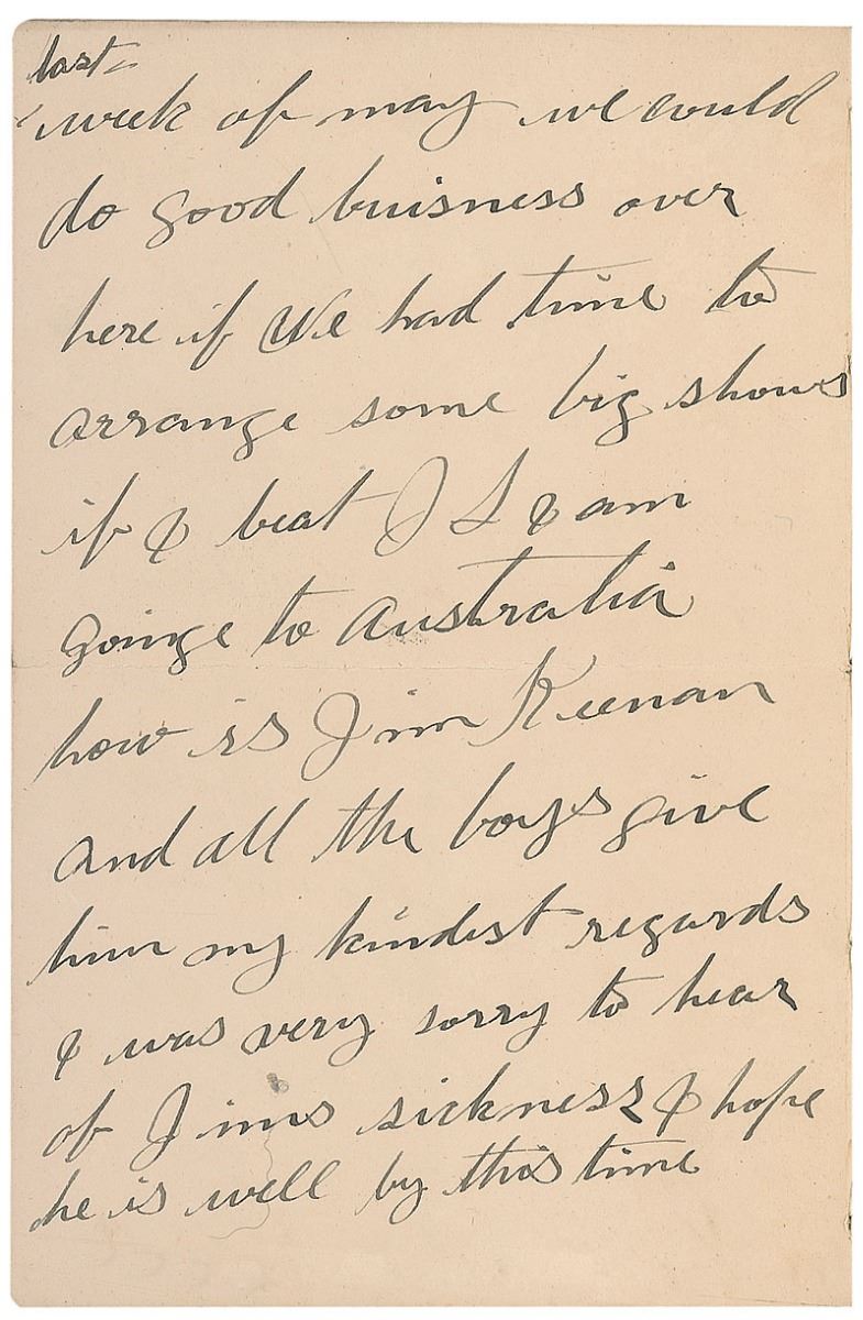 ALS signed “Friend Jake,” four pages on two adjoining sheets, 4.5 x 7, April 22, 1889. Letter to his friend and cornerman Johnny Murphy, in part: “I see by the papers here you are going to fight tall McCarthy of Jersey I wish you the best of good luck old boy get well and keep cool now is your chance to gain a big name as he is a good man with a big name my trip will be a failure as I must come home now and we can’t do anything in the way of showing we would have had a lot of money at the Smith Mitchell show but as you know Smith hurt his foot and he is still laid up with it I am coming home about the last week of May we could do good business over here if we had time to arrange some big shows if I beat J. S. I am going to Australia how is Jim Keenan and all the boys give him my kindest regards I was very sorry to hear of Jims sickness I hope he is well by this time…hoping you will win.” Attractively bound in a gilt-stamped leather folder. In fine condition, with a few stray ink marks to final page. An incredible letter mentioning his impending fight against “J. S.”—John L. Sullivan—which would take place on July 8, 1889, as the last world heavyweight championship prizefight decided with bare knuckles under London Prize Ring rules.