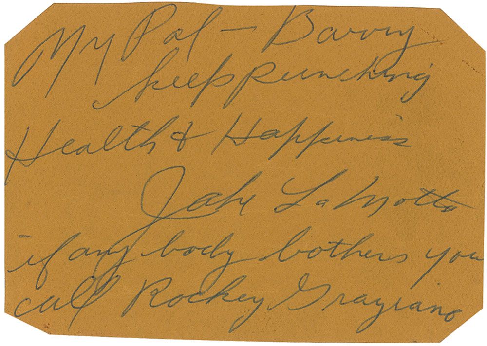 Vintage ballpoint signature and inscription, “My pal—Barry, keep punching, Health & Happiness, Jake LaMotta. If any body bothers you call Rocky Graziano,” on a beige 5.5 x 3.75 album page. A horizontal crease through signature, a few other creases, and trimmed corners, otherwise fine condition.