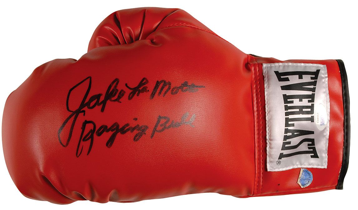 Everlast left-handed 10-ounce boxing glove signed in black felt tip on the top, “Jake LaMotta, Raging Bull.” In fine condition. Accompanied by a certificate of authenticity from PSA/DNA.