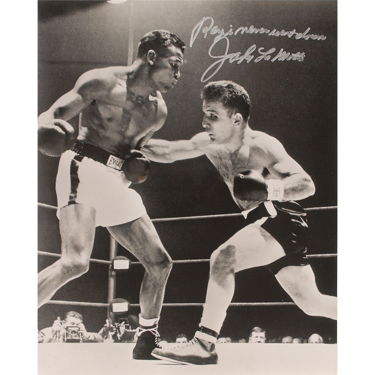 Glossy 16 x 20 photo of LaMotta in the ring against Sugar Ray Robinson, signed in silver ink, “Ray I never went down, Jake LaMotta.” In fine condition.