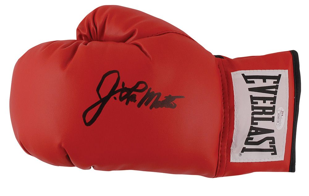 Red Everlast left-handed boxing glove signed in black felt tip on the top, “J. LaMotta.” In fine condition, with a JSA authentication label affixed to wrist.