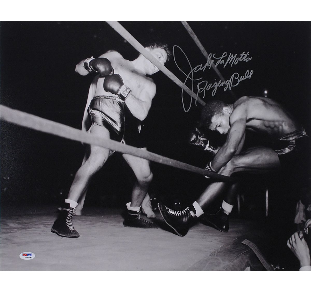 Satin-finish 20 x 16 photo of LaMotta knocking Sugar Ray Robinson out of the ring, signed in silver ink, “Jake LaMotta, Raging Bull.” In fine condition, with a PSA/DNA label affixed to the lower left corner. Accompanied by a certificate of authenticity from PSA/DNA.