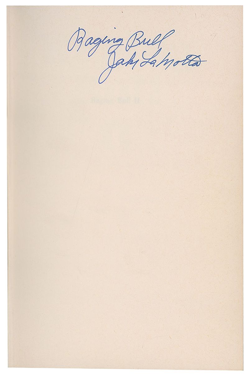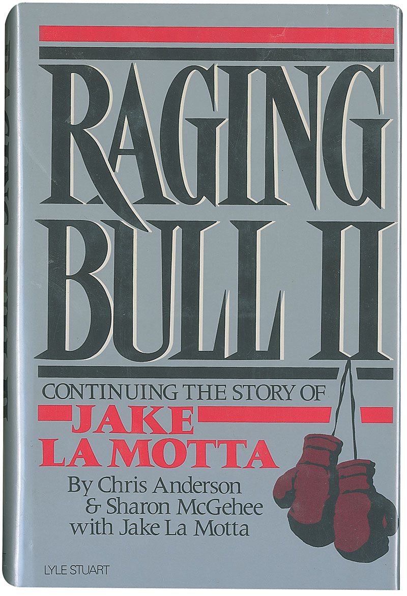 Signed book: Raging Bull II. First edition. New Jersey: Lyle Stuart Inc. 1986. Hardcover with dust jacket, 6.25 x 9.25, 254 pages. Signed on the first free end page, “Raging Bull Jake LaMotta.” In fine condition, with a few creases to dust jacket.