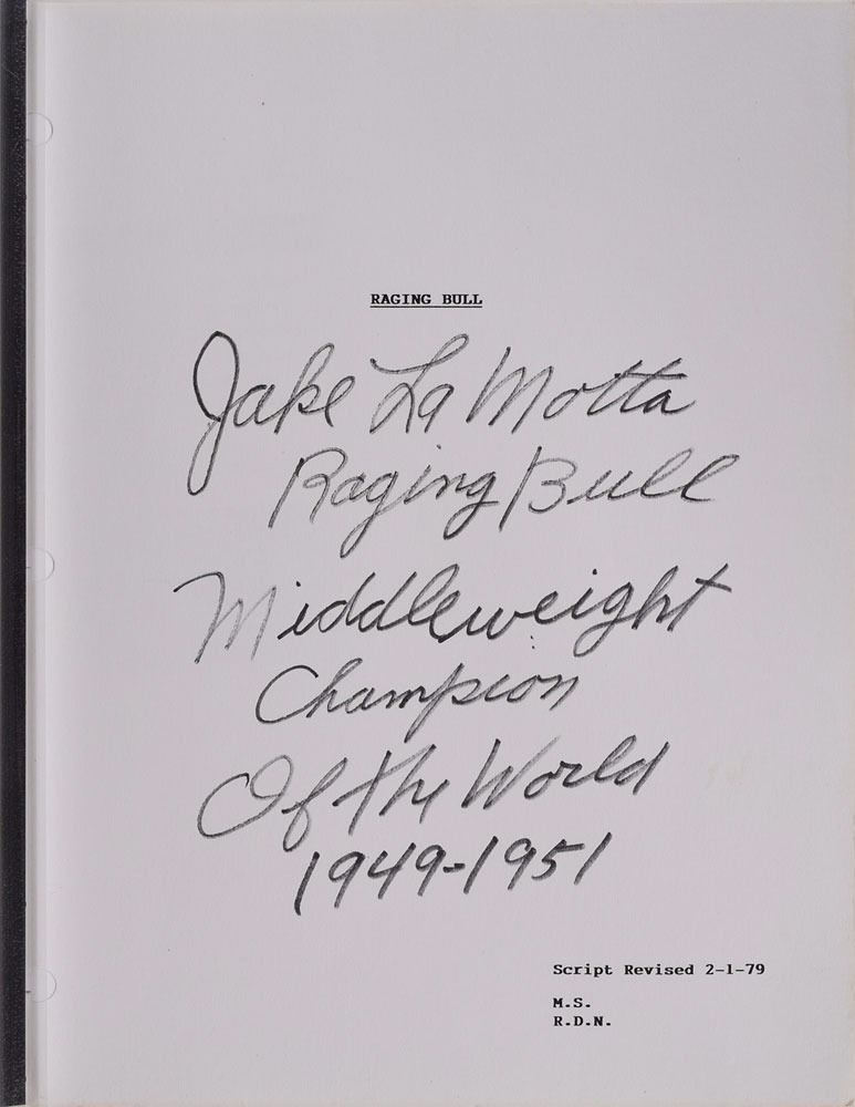 Copy of the script for the classic 1980 film Raging Bull, 101 pages, 8.5 x 11, prominently signed on the cover sheet in black felt tip, "Jake LaMotta, Raging Bull, Middleweight Champion of the World, 1949–1951." In fine condition, with a JSA label affixed to the reverse of the signed page. Accompanied by a certificate of authenticity from JSA. The consignor notes that this belonged to LaMotta at one time, and was given to his friend Jack Moore.