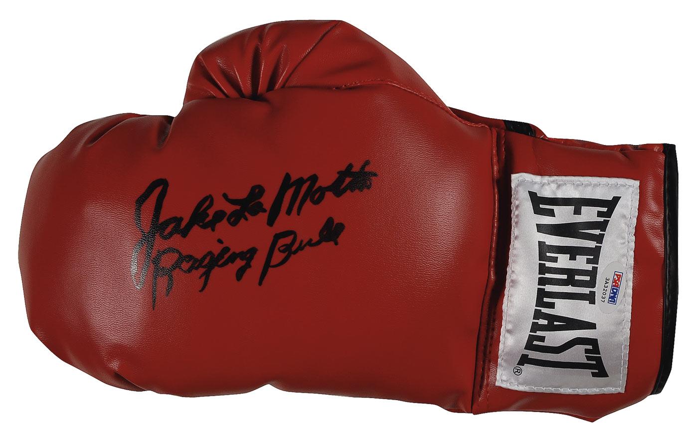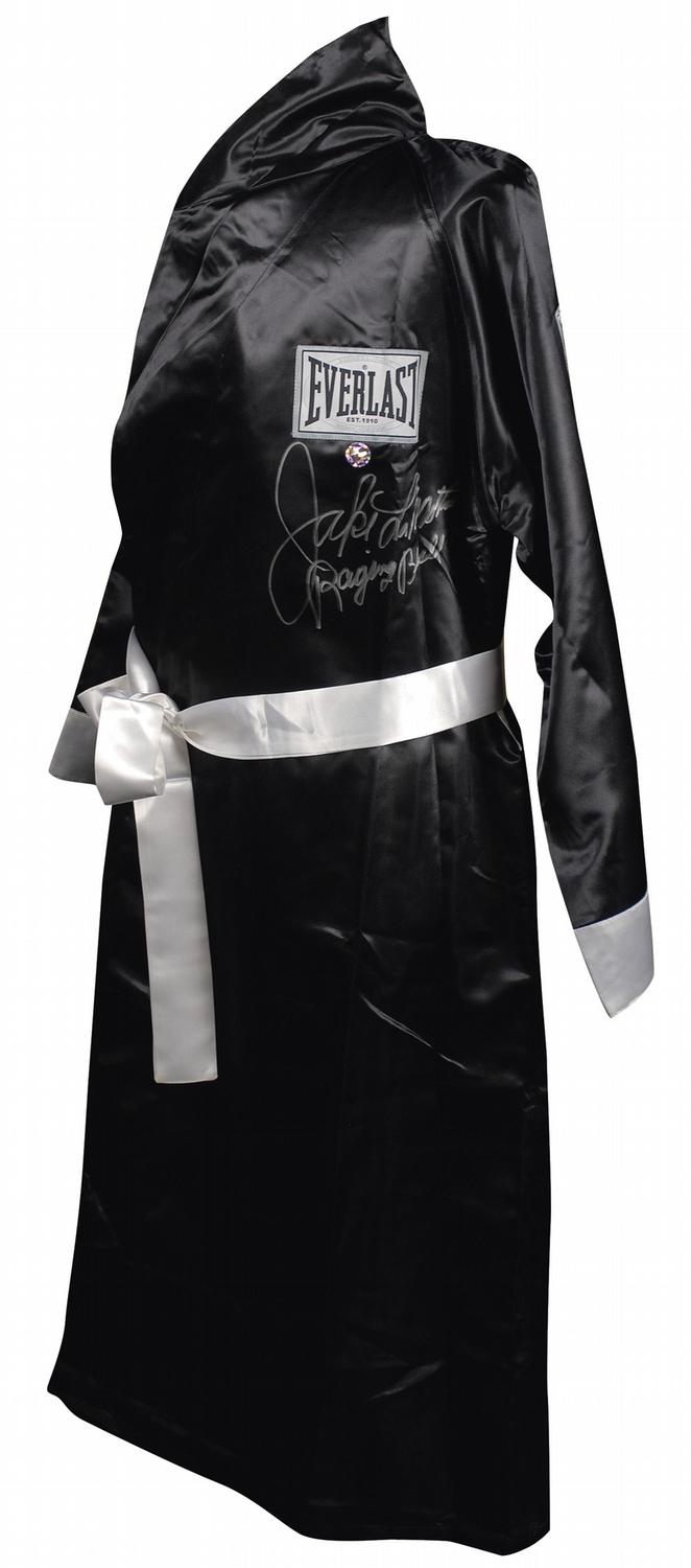 Two items: black silk Everlast boxing robe signed in silver ink on the front, “Jake LaMotta, Raging Bull”; and an Everlast left-handed boxing glove, signed in black felt tip in the same manner with a PSA/DNA authentication label affixed. In very fine condition.