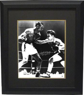 Jake LaMotta had one of the best chins in boxing history. In over 110 fights against the greatest middleweights in history, LaMotta was only knocked to the canvas once in his entire 14-year career. Turning pro in the early 1940s, LaMotta ran up an impressive undefeated streak before losing. He was the first fighter to defeat the great Sugar Ray Robinson (Robinson was 40-0). LaMotta claimed to have "taken a dive" against "Blackjack" Billy Fox in New York City. Later, LaMotta captured the World Middleweight Title from the legendary Frenchman Marcel Cerdan. So fascinating was LaMotta's life and career that director Martin Scorsese made the film classic Raging Bull about him, with Robert De Niro delivering an Oscar-winning performance as La Motta. Jake LaMotta has hand signed this B&W 16X20 Photo in ring punch with Raging Bull inscription. Certificate of Authenticity from Athlon Sports. Custom Black Mat and Premium Black Color Framed as shown.