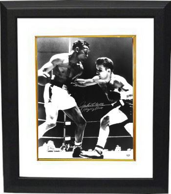 Jake LaMotta had one of the best chins in boxing history. In over 110 fights against the greatest middleweights in history, LaMotta was only knocked to the canvas once in his entire 14-year career. Turning pro in the early 1940s, LaMotta ran up an impressive undefeated streak before losing. He was the first fighter to defeat the great Sugar Ray Robinson (Robinson was 40-0). LaMotta claimed to have "taken a dive" against "Blackjack" Billy Fox in New York City. Later, LaMotta captured the World Middleweight Title from the legendary Frenchman Marcel Cerdan. So fascinating was LaMotta's life and career that director Martin Scorsese made the film classic Raging Bull about him, with Robert De Niro delivering an Oscar-winning performance as La Motta. Jake LaMotta has hand signed this B&W 16X20 Photo in ring punch with Raging Bull inscription. Certificate of Authenticity from Athlon Sports. Custom White Mat and Premium Black Color Framed as shown.