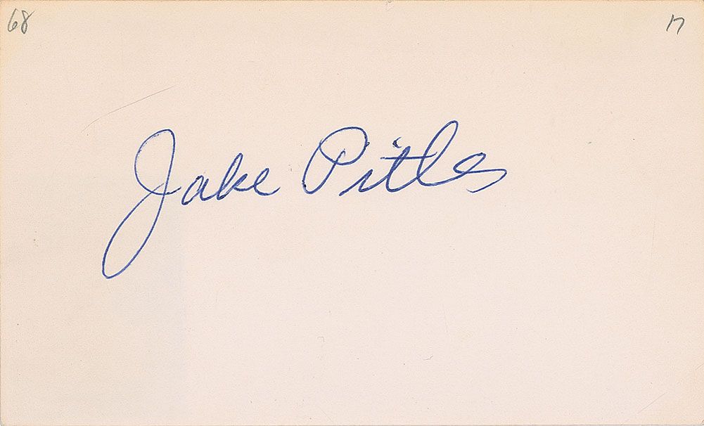 Baseball player (1894–1968) who played one season for the Pirates in 1917, but is most known for being a coach for the 1955 Brooklyn Dodgers. Vintage ballpoint signature, “Jake Pitler,” on an off-white 5 x 3 card. In fine condition.