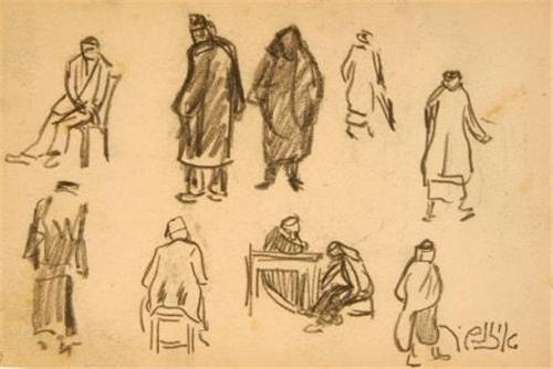 Jakob Eisenscher, 1896 - 1980, Figures, Arab's Cafe, Charcoal, 13.5x20 cm, Stamped with the estate stamp, , , Double sided drawing, on the second side: Sitting Turkish, ,