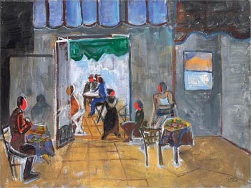Jakob Eisenscher, 1896 - 1980, Figures in Cafe, Oil on canvas, 46x61 cm, Signed with the estate stamp, , , , ,