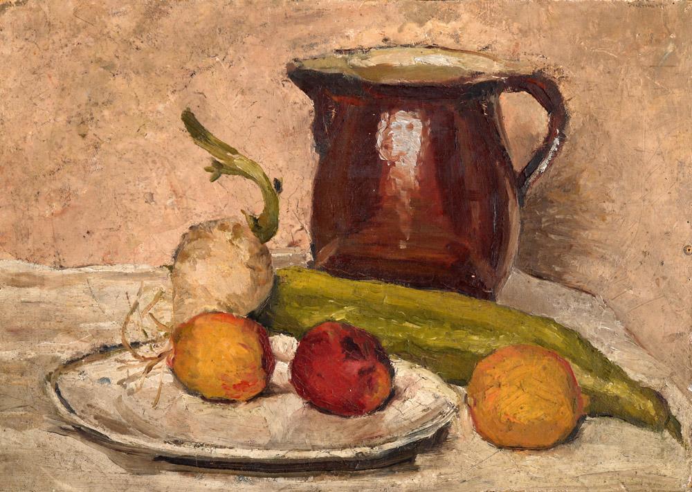 Jakob Steinhardt, German and Israeli Art, 1887 - 1968, Still Life with Fruit and Jug, ca. 1906, Oil on cardboard, 35x50cm, Signed., , , The grandson of the artist's sister. The painting was given by the artist as a present to his sister, Selma Steinhardt Hirsh., ,