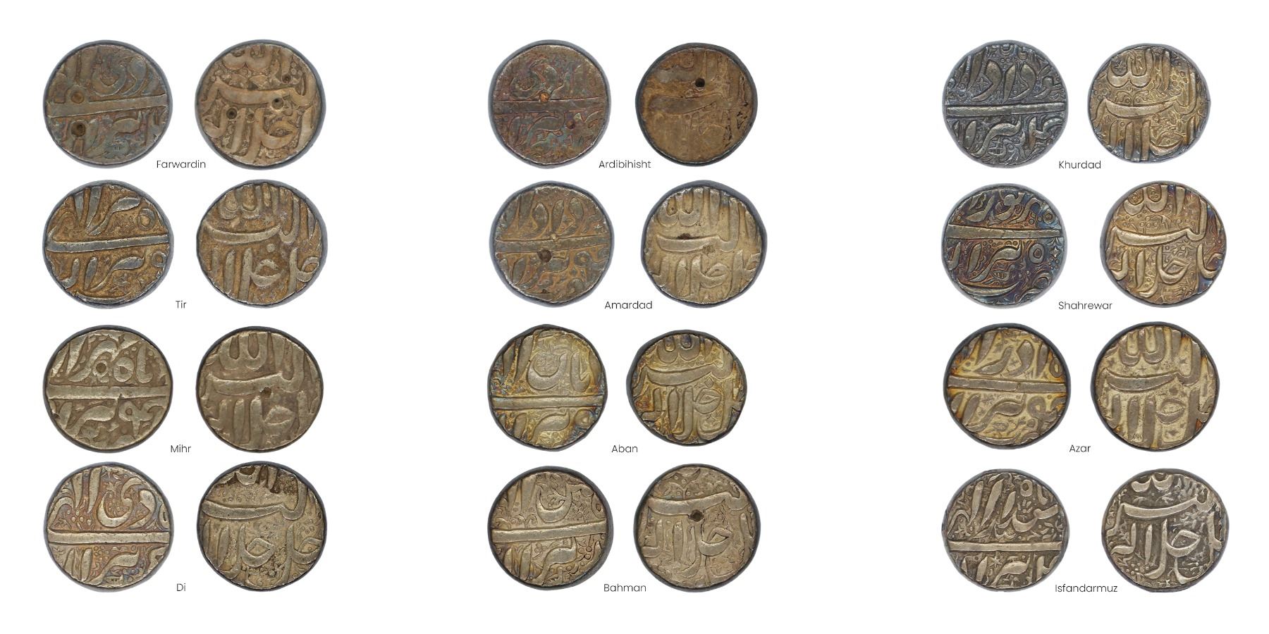 Akbar (AH 963-1014 / 1556-1605 AD), Silver Rupee Set, Berar Mint with Bird below mint name, Complete set of 12 different months, Ardibihisht (11.24g, 17.07mm), Bahman (11.38g, 17.38mm), Shahrewar (11.42, 17.12mm), Isfandarmuz (11.39g, 17.89mm), Tir (11.40g, 17.86mm), Azar (11.42g, 17.26mm), Amardad (11.36g, 17.29mm), Khurdad (11.40g, 17.07mm), Aban (11.42g, 17.46mm), Farwadin (11.37g, 17.40mm), Di (11.39g, 17.47mm) and Mihr (11.34g, 17.04mm), Jal-jalla-lah Allahu Akbar legend on obv., floral design on both sides. (KM # 93.6). Very Fine to Extremely Fine. Very rare in bird type complete set.
