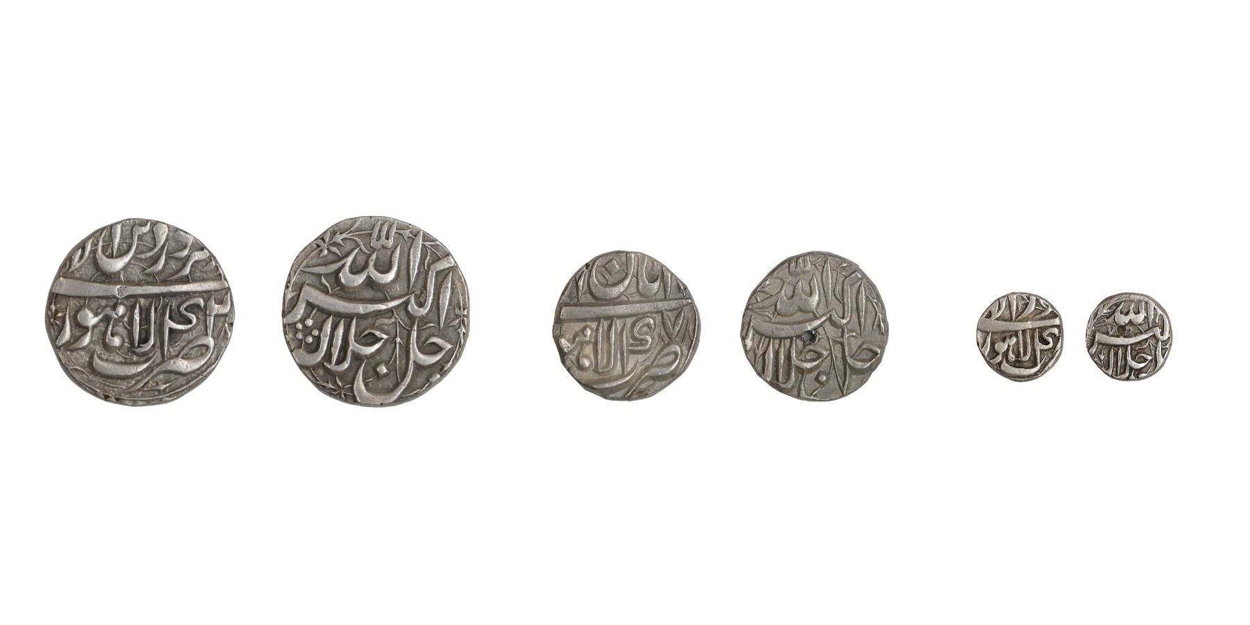 Akbar (AH 963-1014 / 1556-1605 AD), A set of Rupee 11.37g, 22.37mm, 1/2 Rupee 5.66g,15.96mm, and 1/4 Rupee 2.79g, 12.67mm, Lahore Mint, Ilahi type, Month Farvardin/42, Aban/47 and Azar/48 Year, floral design on rupee, Jal-jalla-lah Allahu Akbar legend on obv. (KM # 93.11, 66.3 & amp; 58.2). Very Fine. Rare as Set.